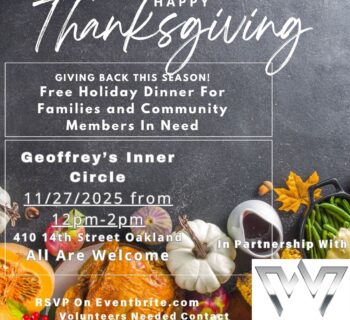 FREE EVENT PLEASE RSVP https://www.eventbrite.com/e/1967891698043?aff=oddtdtcreator Come and enjoy a delicious holiday meal courtesy of Geoffrey's Inner Circle. We are giving back to our community and supporting our most food insecure ...