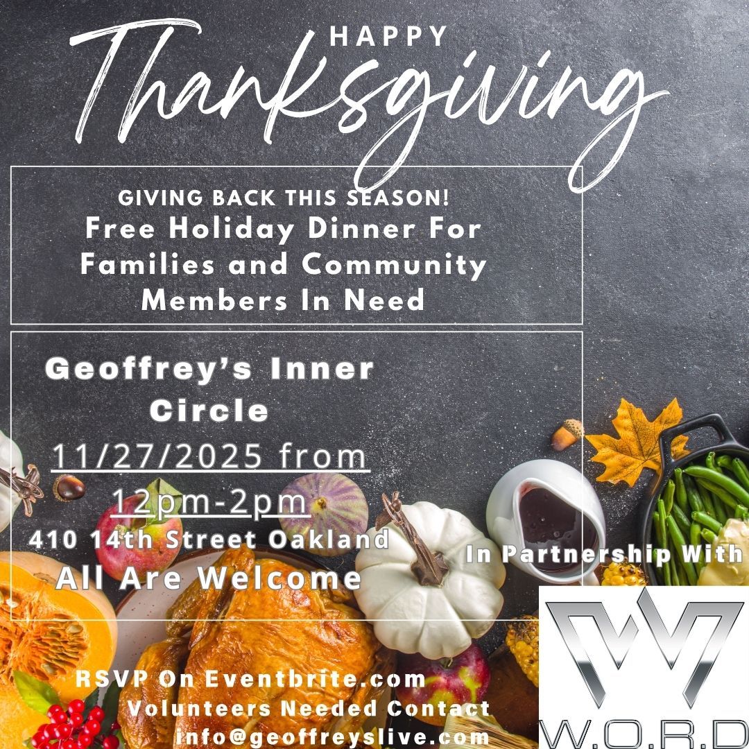 Come and enjoy a delicious holiday meal courtesy of Geoffrey's Inner Circle. We are giving back to our community and supporting our most food insecure community members with love.