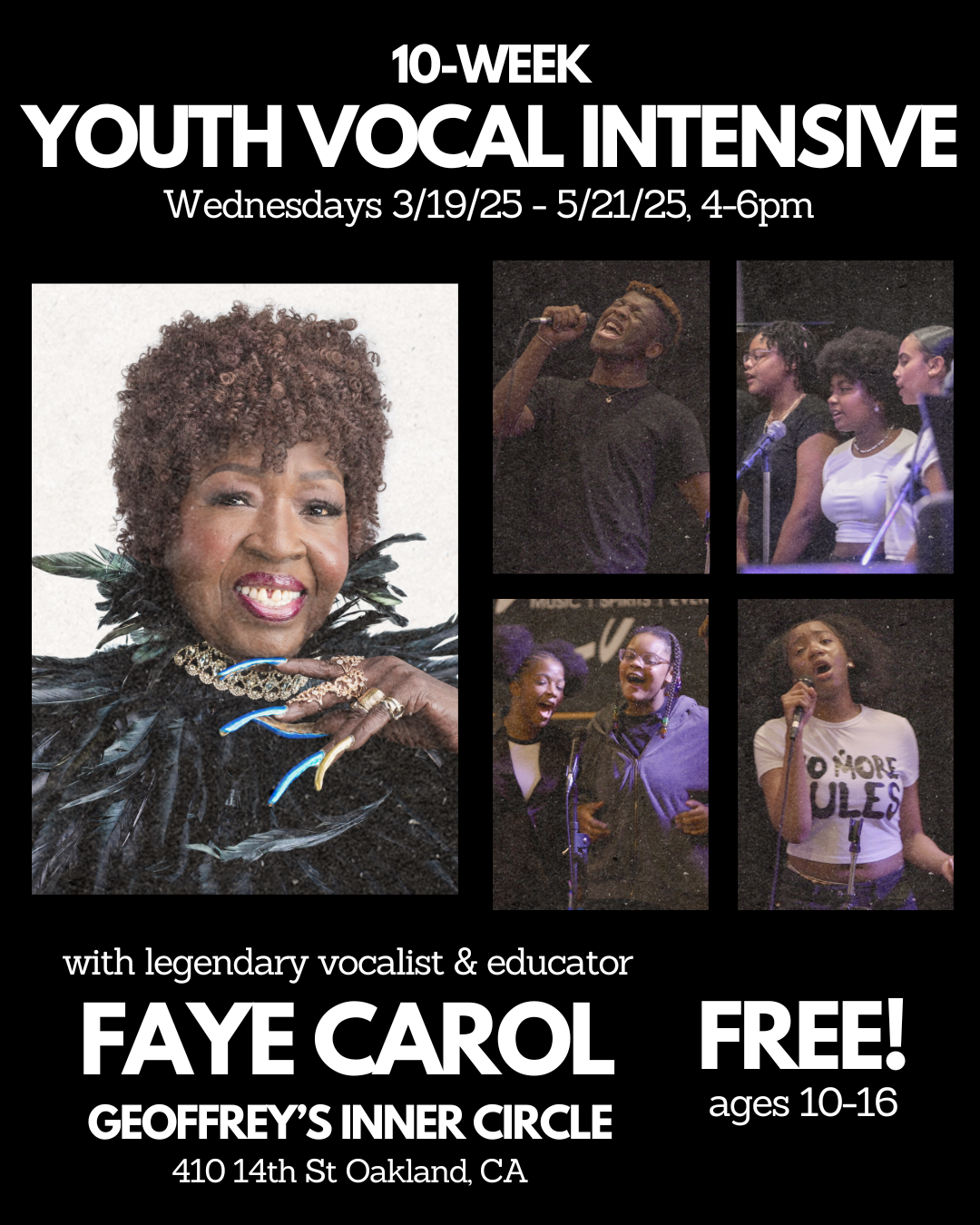 Classes are held at Geoffrey’s Inner Circle every Wednesday 4-6pm beginning March 19 for 10 weeks. Enrollment is now open! This program is offered at no cost for youth participants ages 10-16 of all skill levels. Our goal is to instill and cultivate a love of the arts in each student, with a well-rounded, powerful curriculum in vocal performance. We aim to foster a community based on mutual respect and encouragement so all students of all levels can discover and explore their creativity and expression. Students will discover the joy of singing and explore their unique voice through solo and group expression, harmony, repertoire, improv, history, and confidence-building, culminating in a recital performance for the community. For more info or to apply visit: https://www.fayecarol.com/10-week-int...
